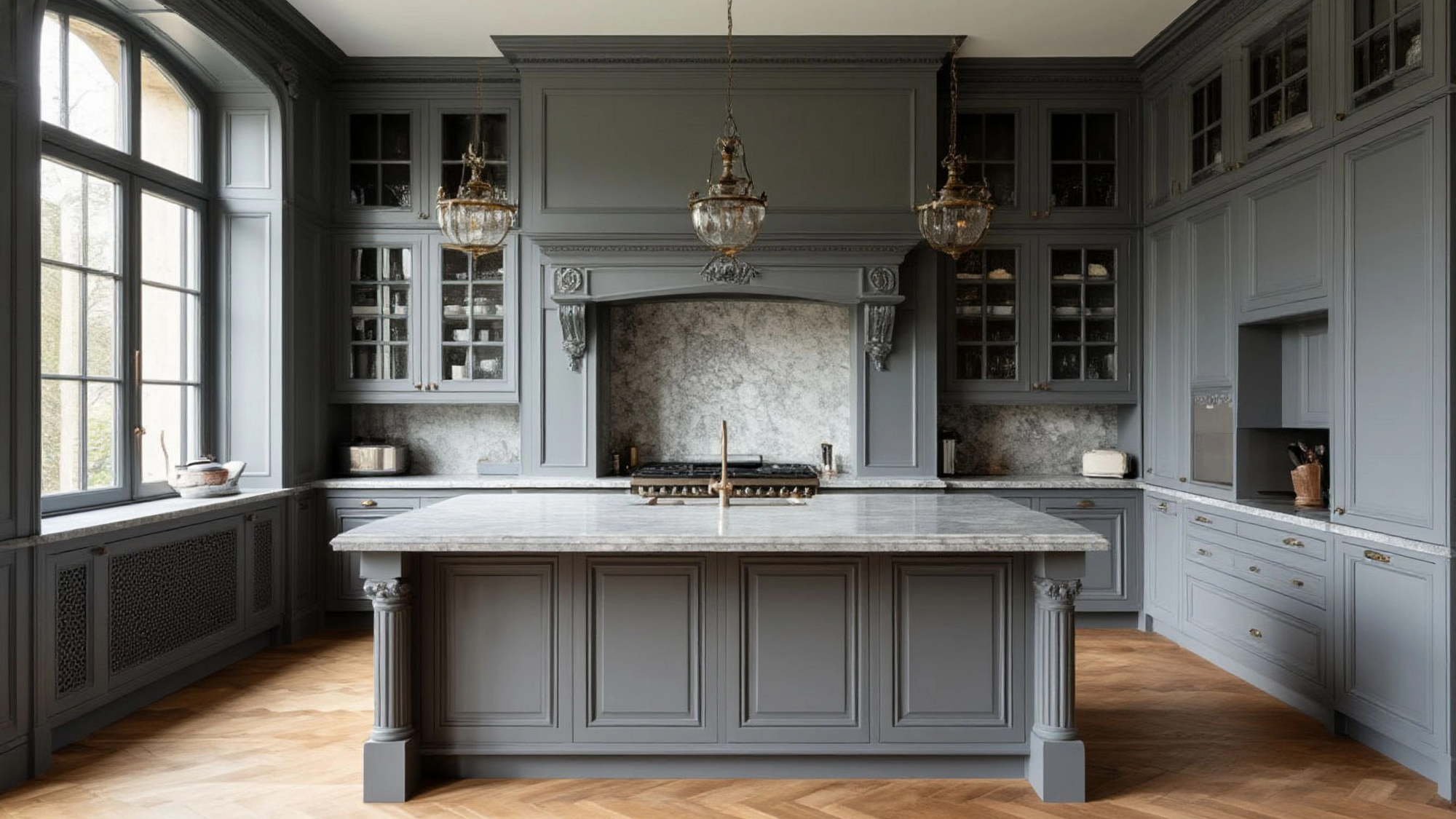Эстетика кухни в стиле барокко проявляется в изысканных пропорциях, симметрии и внимании к мелким деталям. Плавные линии фасадов и декоративные элементы создают ощущение величия и легкости одновременно, а серый цвет добавляет интерьеру сдержанности и современности. Такой дизайн вызывает положительные эмоции, создавая атмосферу тепла и гармонии, где каждая деталь радует глаз и вдохновляет на творчество в приготовлении блюд.