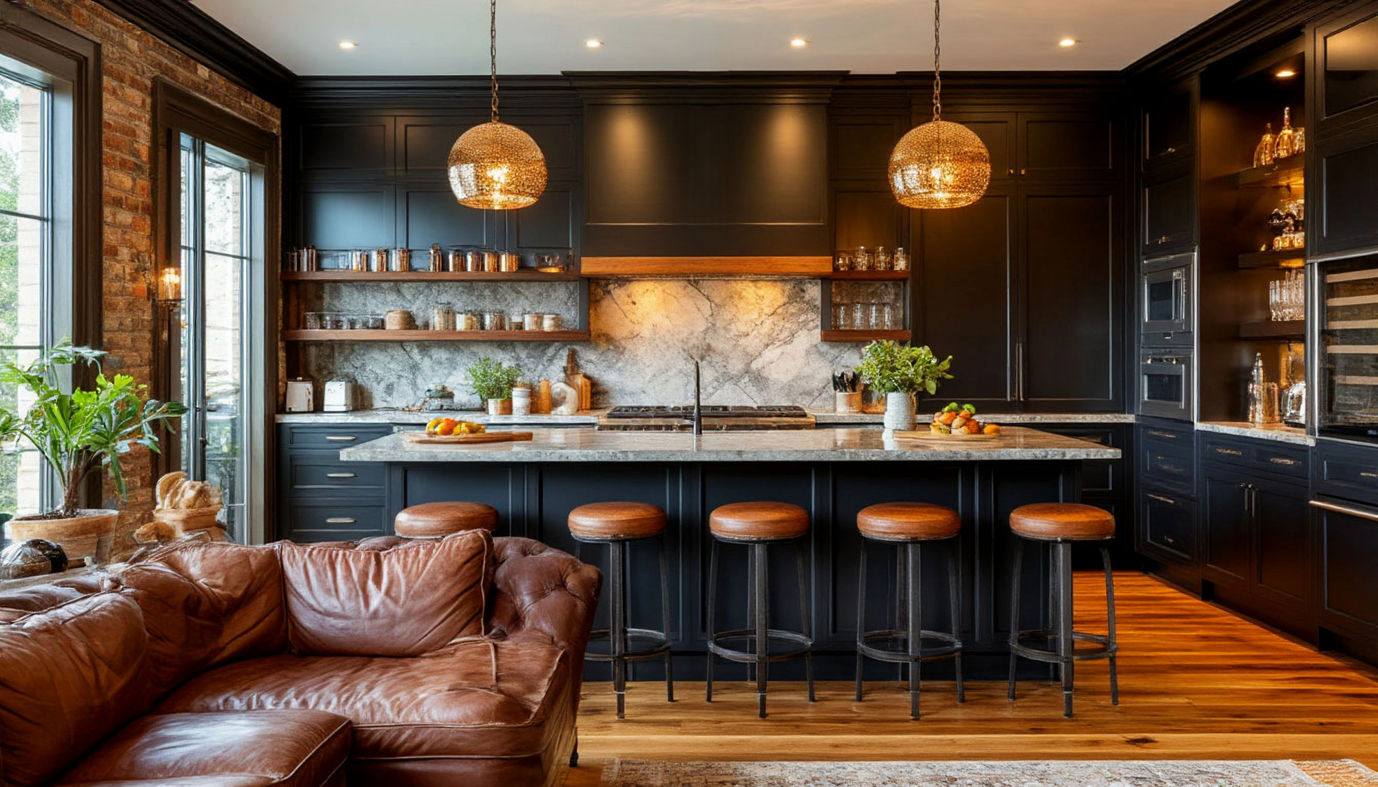 Особую атмосферу кухни создают детали и аксессуары. Металлические элементы, строгие линии, лаконичные ручки и глубокий черный цвет фасадов формируют визуальную структуру, а коричневый кожаный диван добавляет тактильное тепло. Мягкое освещение подчеркивает глубину черного цвета, создавая эффект камерности и интеллектуальной элегантности. Интерьер кухни "Дарвелл" не просто функционален, он выражает характер, статус и вкус владельца, делая пространство уникальным и запоминающимся.