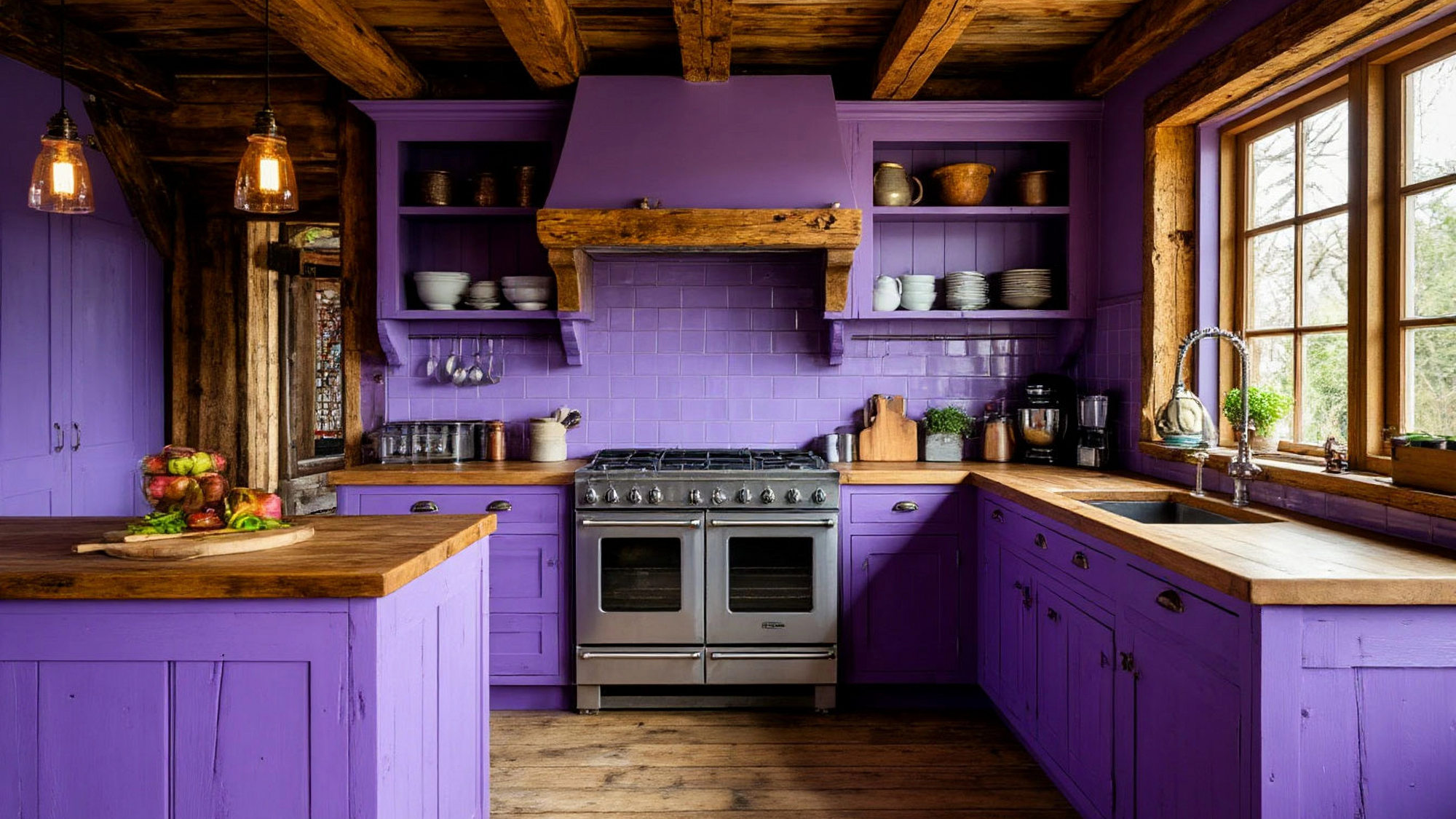 Деревенский стиль кухни проявляется не только в фасадах и текстурах, но и в общей композиции. Простота форм и внимание к деталям создают пространство, которое ощущается естественно и уютно. Мягкие линии мебели, тёплые оттенки дерева и гармоничная игра света на фиолетовых фасадах формируют неповторимую атмосферу, где каждая минута проведённого времени становится приятной и комфортной.