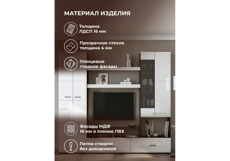 • Изысканный МДФ 16 мм в пленке ПВХ: Фасады стенки, которые являются ее визитной карточкой, изготовлены из МДФ толщиной 16 мм, покрытого высококачественной пленкой ПВХ. МДФ известен своей плотностью, однородностью и способностью к тонкой обработке, что позволяет достигать идеально гладкой поверхности. Пленка ПВХ, в свою очередь, придает фасадам не только потрясающий внешний вид, но и обеспечивает дополнительную защиту от влаги, механических повреждений, выцветания и агрессивных химических веществ. Это значит, что глянцевые поверхности Jimenez будут сохранять свой блеск и насыщенность цвета без особого труда.