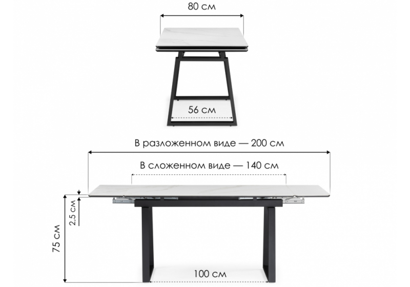 Керамический стол Джек 140(200)х80 белый мрамор alpin white / черный (80x75)